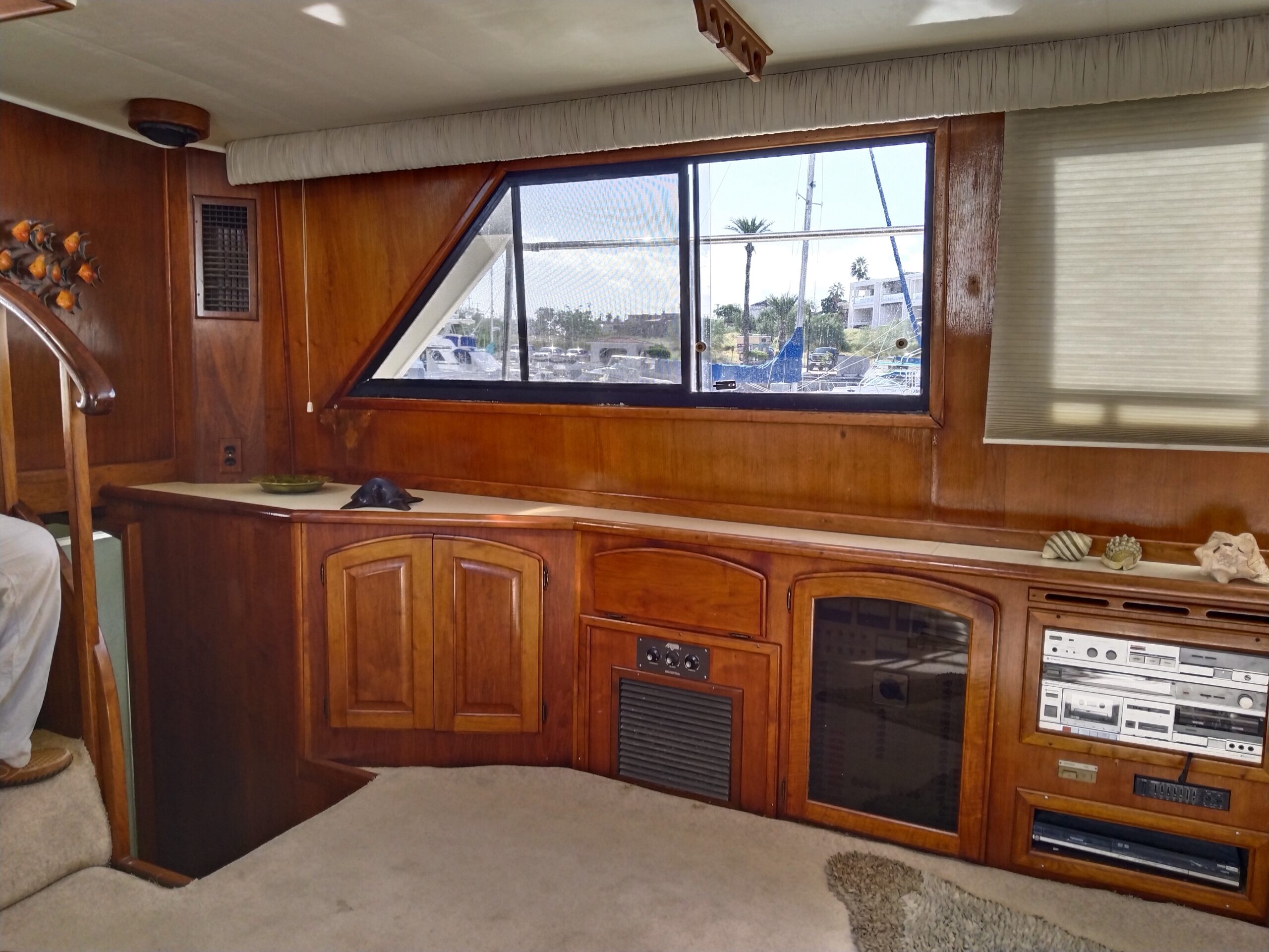 - Three fuel tanks: aft under fishing cockpit 340 gallons, main under primary stateroom bed 235 gallons, forward tank under floor of second stateroom 305 gallons
